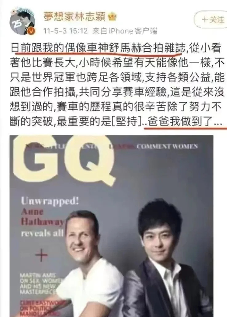 在2011年,林志颖在微博PO出一张和舒马赫的合照,言语间满满的骄傲与自豪,文末更是感性写到“爸爸我做到了”。
