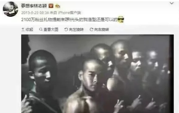 2013年,林志颖为了庆祝微博粉丝达到2100万,特意放出一张自己光头的照片。