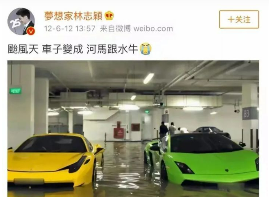 2012年,林志颖的盗图瘾又犯了,他在微博晒出一张跑车被水泡的图片,还配文“河马跟水牛”。网友们纷纷表示林志颖财大气粗的同时,也对被泡的高档跑车深感惋惜。