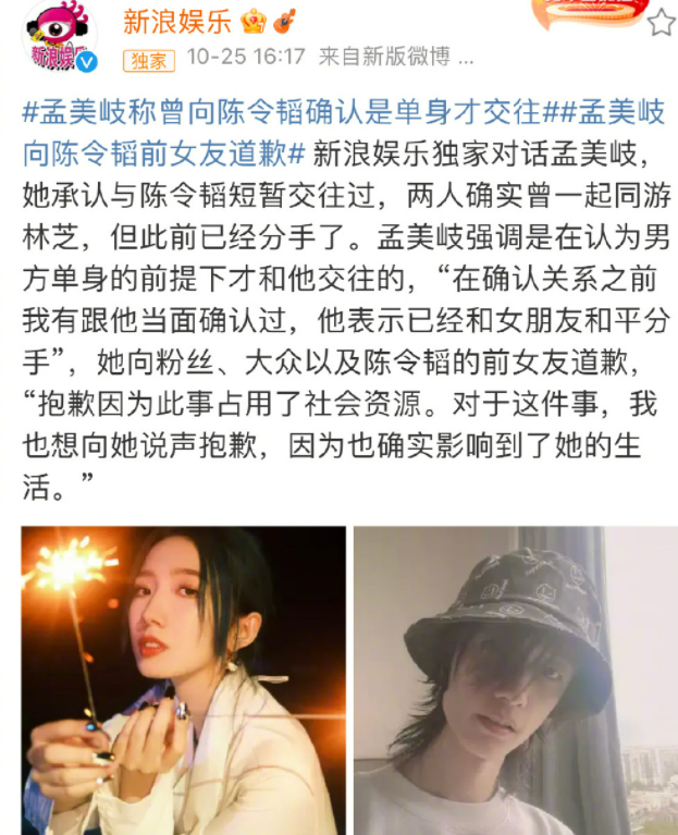后来,孟美岐又被媒体曝光“知三当三”插足别人的感情,而在这次事件中,孟美岐也撒了谎。