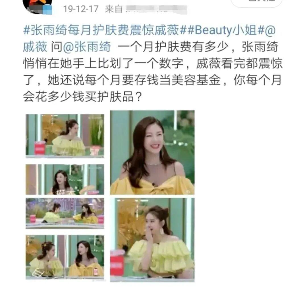 她曾在《Beauty小姐》里面被追问过会花多少钱护肤,当时她在戚薇手上写下一个数字,连戚薇都被惊吓到了,能够吓到同款奢侈女神,足以见得张雨绮到底有多能花钱了。