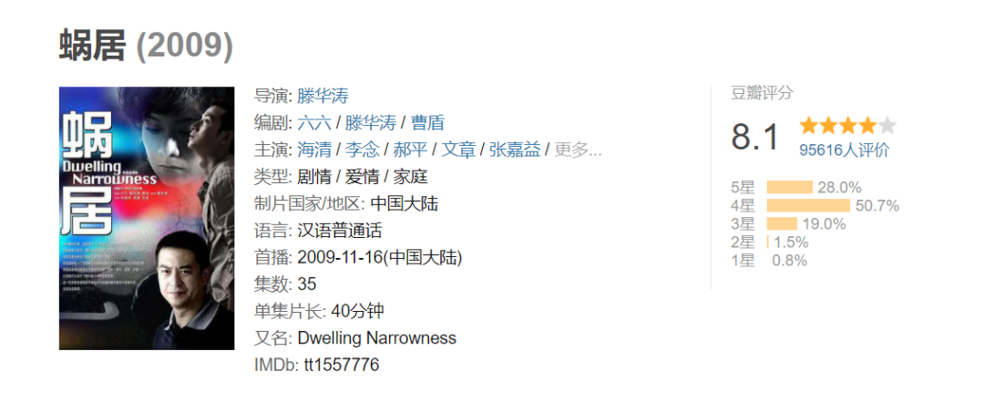 《蜗居》更关注的其实是“居”,它更多的是将故事停留在物质层面,郭海萍姐妹为了居所奔波,从而引发了更多的悲剧。