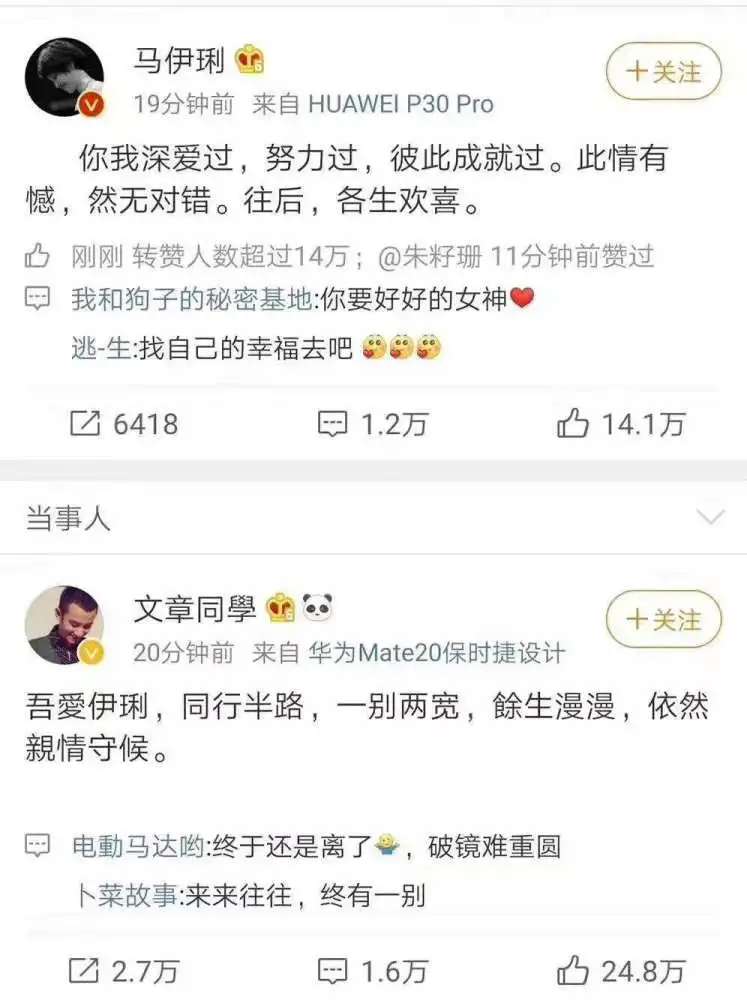 就在同一天,马伊琍发微博,官宣和文章离婚的消息。