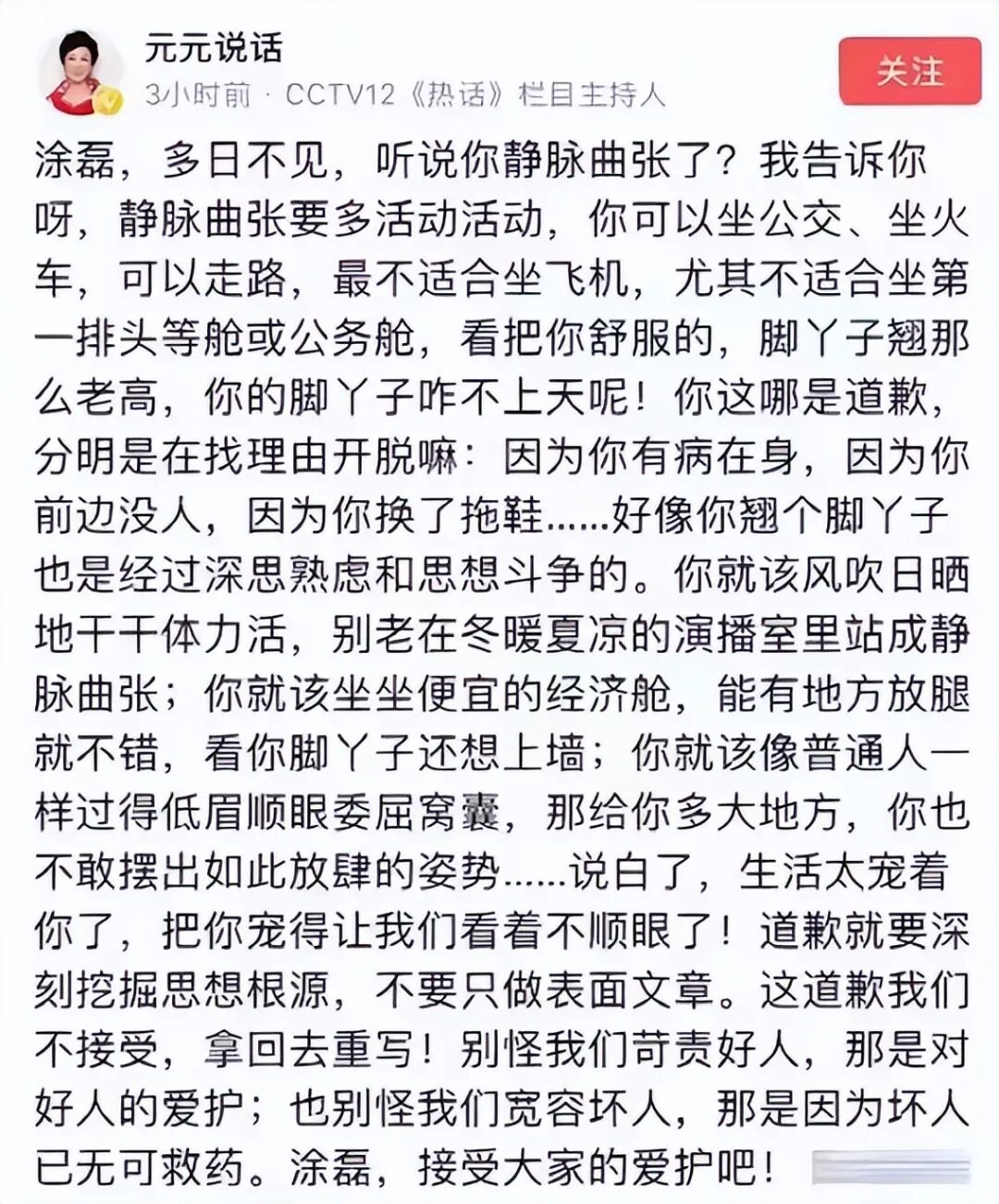 央视主播刘元元发话了,其言词有过之而无不及。涂磊微博粉丝量451万,而刘元元的粉丝仅12.9万,所以也有不少挺涂磊的人说她只不过借机炒作自己罢了。