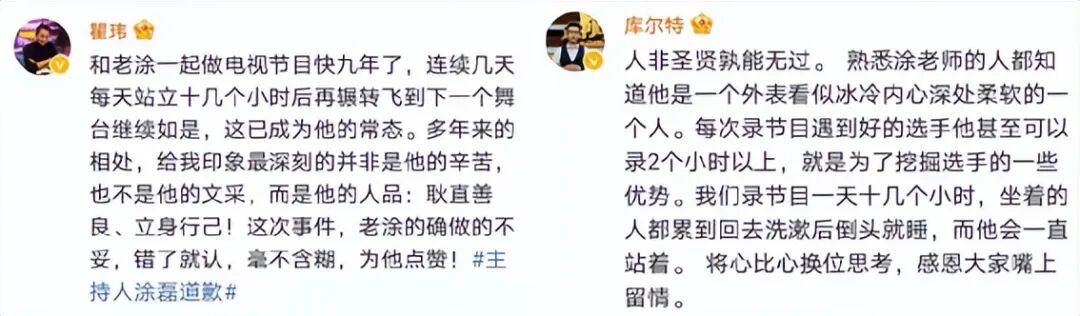事实上,涂磊的人设摆在那,爱他的人爱死,恨他的人也恨死。有攻击他的,自然也会有挺他的,同行的瞿玮和库尔特就站出来说了公道话。