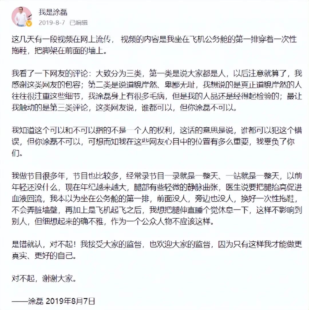 2019年的8月的飞机事件,一段涂磊上完洗手间回到座位,很娴熟地将两脚直接放到舱壁上后休息的视频,瞬间在网上引爆。