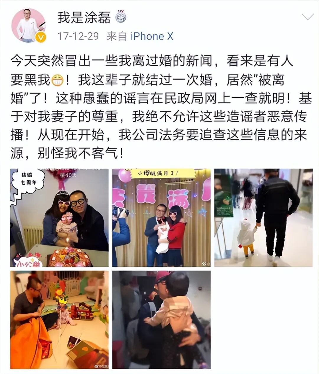 可二年后,又一条关于涂磊离过婚的新闻冒出来了,为了怕这个事件波及到妻女。涂磊不得不再次发文自证。