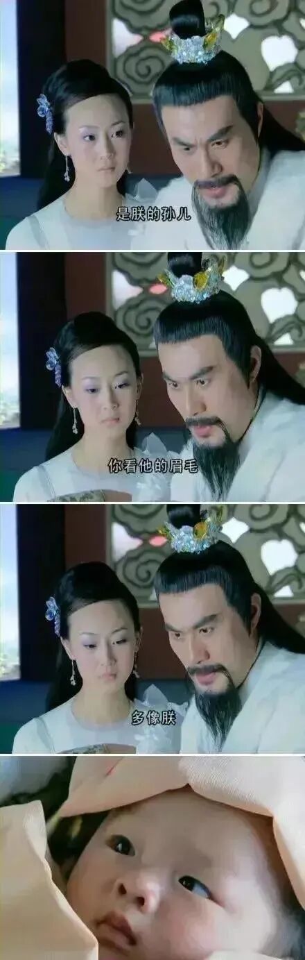 在《天外飞仙》里,徐锦江看到孙子后大吃一惊,语出惊人:“你看他的眉毛,多像朕!”