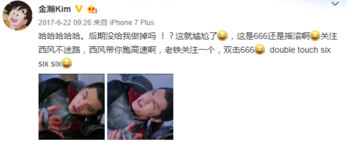 在《楚乔传》里,金瀚饰演的西风被赵丽颖饰演的楚乔砍掉了两根手指,他自己把手指弯了起来,假装断指,后期的老师没给P掉,导致金瀚尴尬到专门发了一条动态。