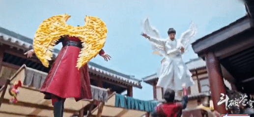 在《斗破苍穹》里,两个演员带着玩具翅膀飞来飞去,翅膀压根动都不动,两人飞得非常僵硬,毫无美感可言。