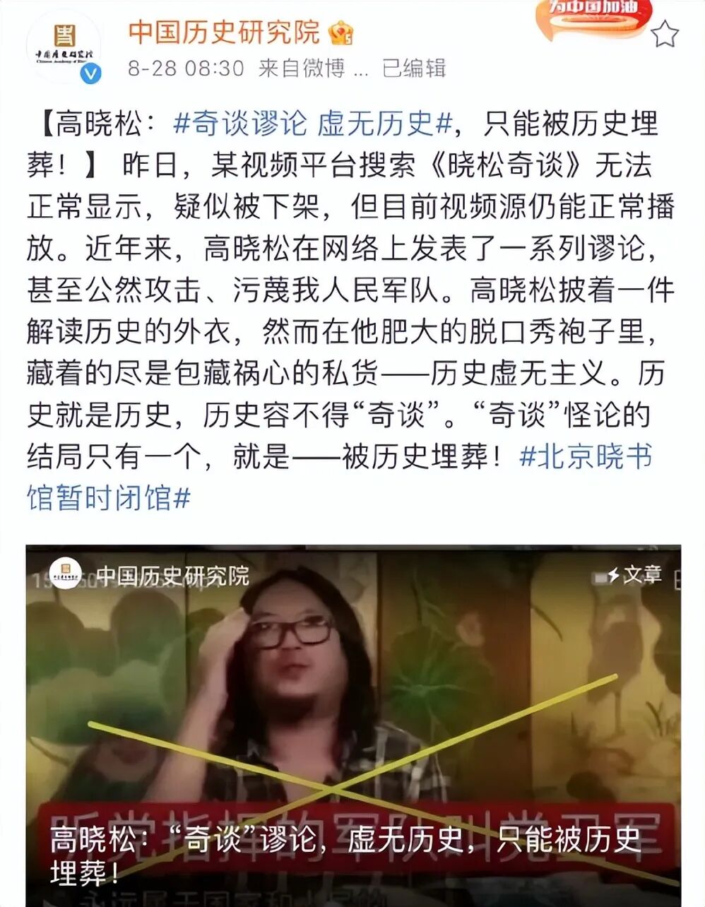 2021年8月28日,中国历史研究院官博正式喊话,说出了无数中国人的心声:“高晓松披着解读历史的外衣,然而在他肥大的脱口秀袍子里,藏着的尽是包藏祸心的私货——历史虚无主义。”