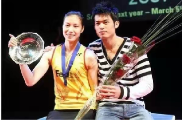 2007年全英杯,两人双双夺冠。谢杏芳正在领奖时林丹又给了她惊喜。