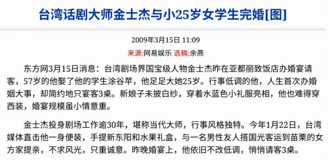 2009年,发誓不婚的金士杰,被媒体拍到拎着两袋点心,态度虔诚地出现在涂家拜见未来岳父岳母。