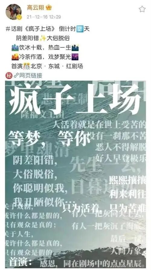 沉寂了一年,高云翔改名高晟晖,自己做制片人,自编自导了一部话剧《疯子上场》,最后票房惨淡。