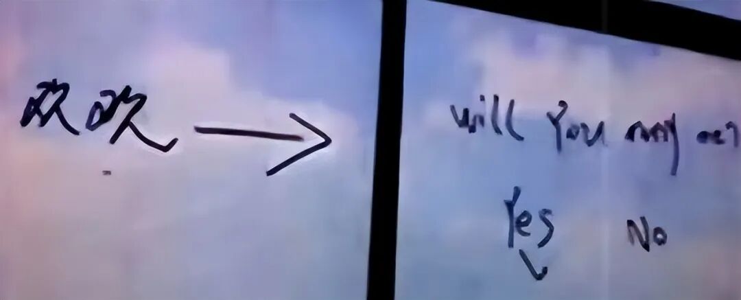 没多久,高云翔在电话里,让董璇走到长廊的尽头,尽头窗上的玻璃,用英文写着“你愿意嫁给我吗”,下面有“是”和“否”的选择。