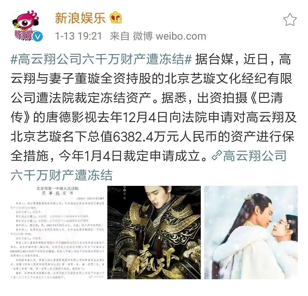 于是,投资方唐德影视将高云翔告上法庭,要求其赔偿5000万,并申请冻结北京艺璇文化公司名下总值6382.4万人民币的资产。