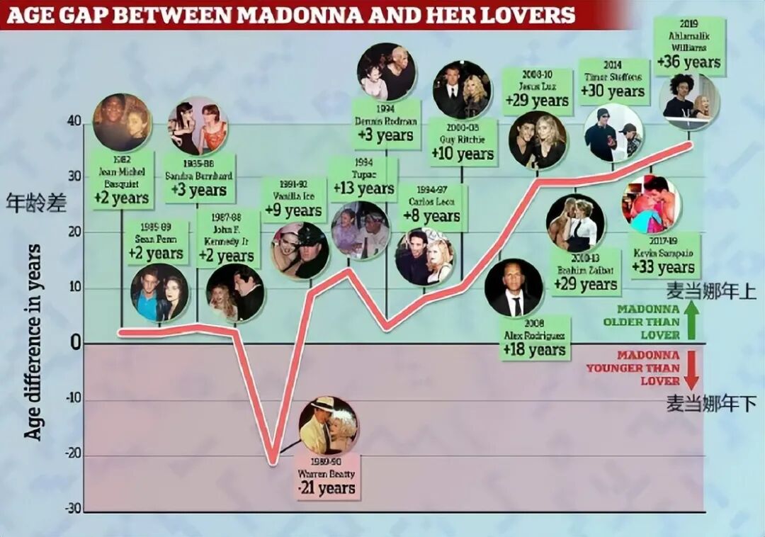 英国《每日邮报》对麦当娜的狂野情史进行了盘点,从图中可以看出,从1982-2022这40年间的16段恋情中,仅好莱坞的花花公子年龄比麦当娜大。