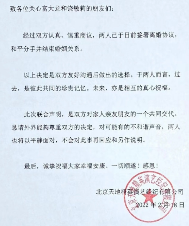 2月18日,一份离婚声明又引爆了娱乐圈。