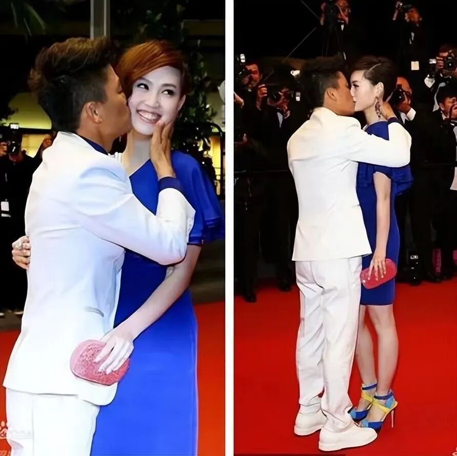 在戛纳电影节里,他带着老婆走着红地毯,突然,来个单膝下跪,并大喊:“我爱你!”还猛亲了马蓉2口,把她的脸都挤变形了。
