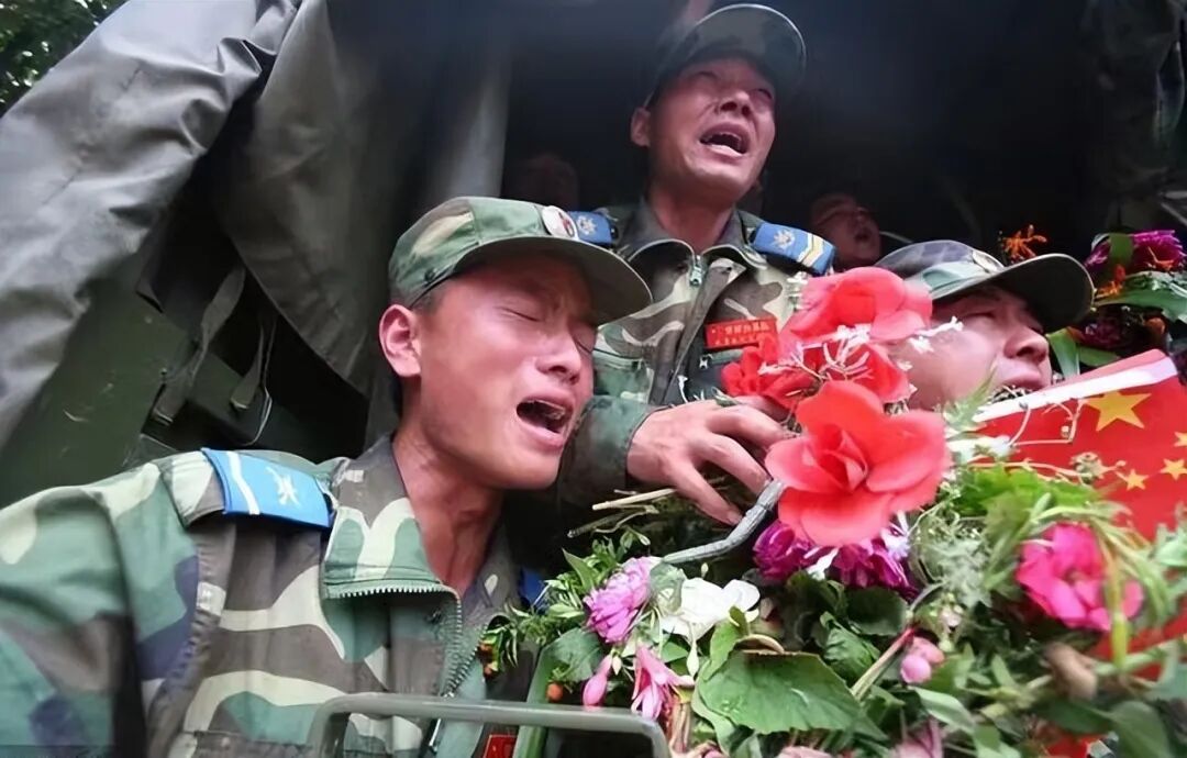 部队离开灾区时,群众哭着追赶部队车辆,往车里扔各种能够表达心意的东西。车下的老百姓在哭,车上的战士也在哭。