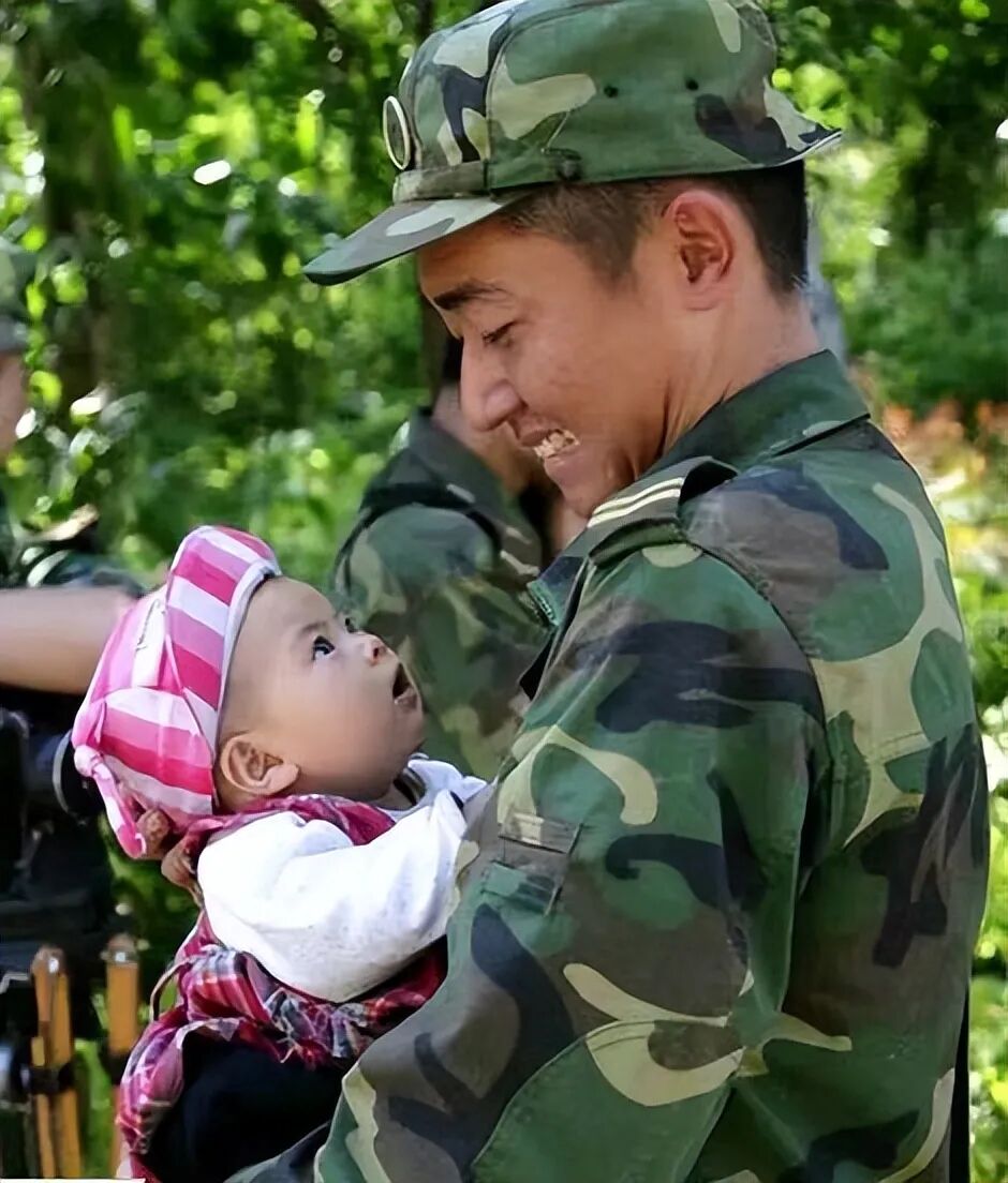 士兵用微笑和橄榄绿军装为婴儿修建了保护的围栏,小婴儿知道那个怀抱才最安全。