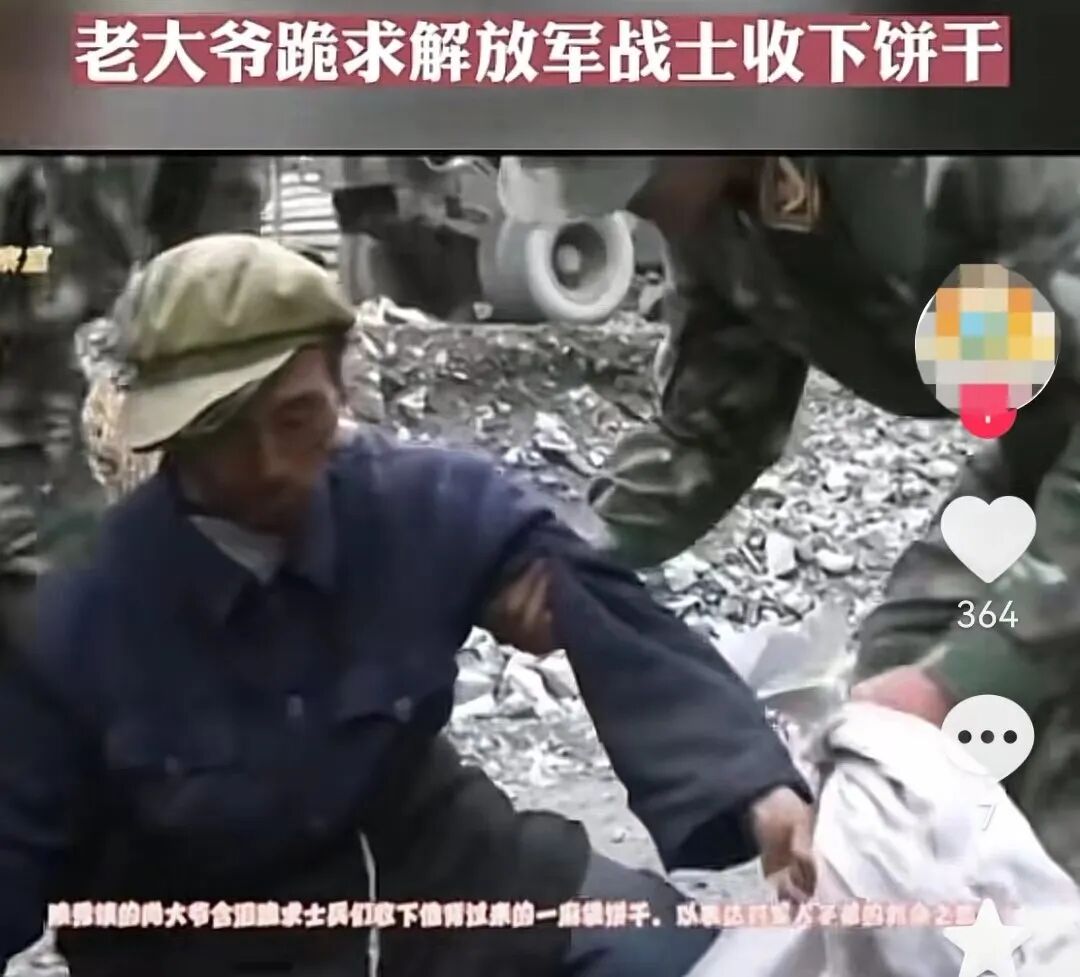 老大爷从废墟里翻出少量珍贵的饼干,走了几个小时的山路赶来送给解放军,只为了让子弟兵不要饿肚子。