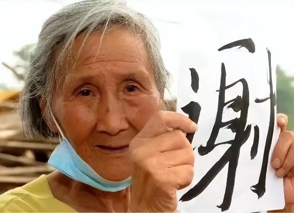孱弱的老奶奶喊不动话、走不动路,但是仍然工工整整写出一个“谢”字,就那么高高举着,眼含热泪。