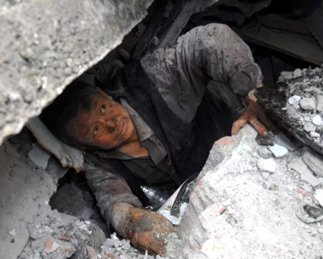 不知等了多久才等来救援人员,但是他拒绝被救,因为旁边的废墟里还有孩子。