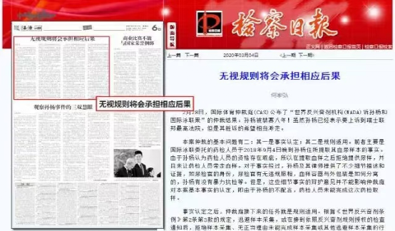 2020年3月5日,央媒《检察日报》刊发长文,直言导致孙杨落得如今结果的原因是无知和无视(规则)。
