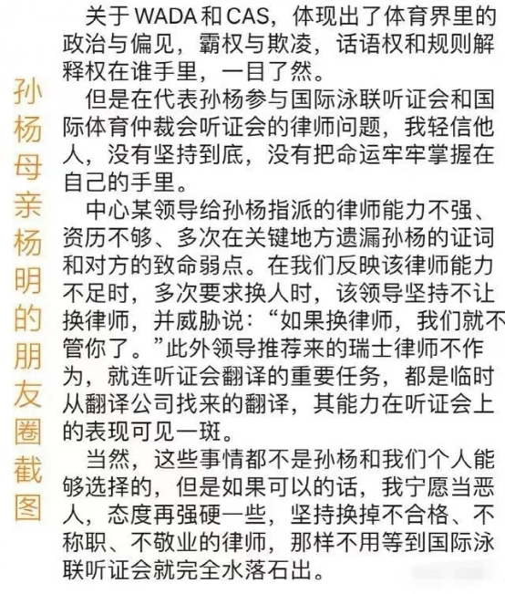 除了微博,杨明还把儿子所有训练、采访、代言活动一手包办,只要和孙杨有关,事无巨细必须她一一做主。
