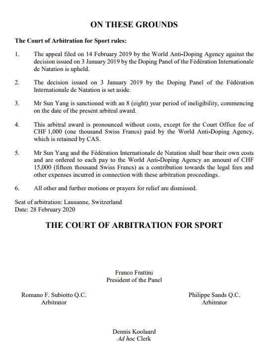 2020年2月28日CAS宣判孙杨被禁赛8年。