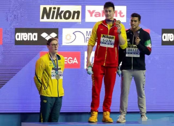 还有在光州世锦赛上,澳大利亚运动员霍顿因为质疑成绩而拒绝在颁奖时与冠军孙杨同登领奖台。愤怒的孙杨举着自己的金牌冲着霍顿怒吼:“你可以不尊重我,但必须尊重中国!”