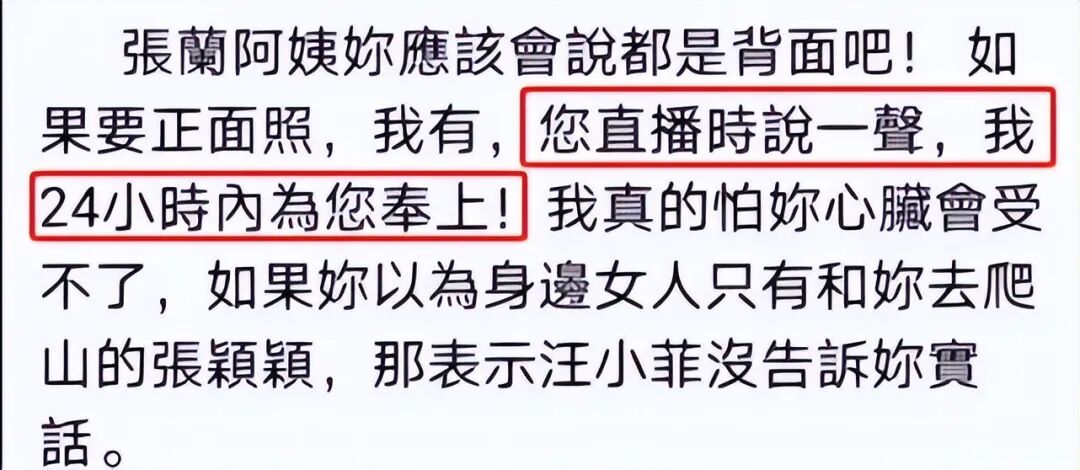 更狠的是,爆料人不仅发了亲密照,还写了一篇长文,直指汪小菲婚内出轨,喊话汪小菲妈妈张兰还有更多证据,如果不服还可以放正面照,不过就怕张兰受不了。