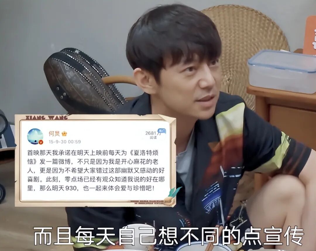 在《夏洛特烦恼》初期做宣传的时候,何炅也是每天都会发微博帮忙宣传,一发就是半个月,就连宣传词都是他自己想的。