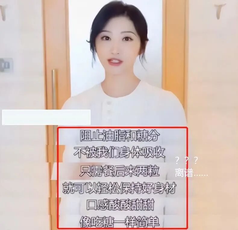 景甜代言的产品宣传其“具有阻止糖、油吸收的功效”,可普通食品不可进行保健、治疗等功效的宣传,而景甜本人曾在拍摄中宣传过这一离谱的卖点。