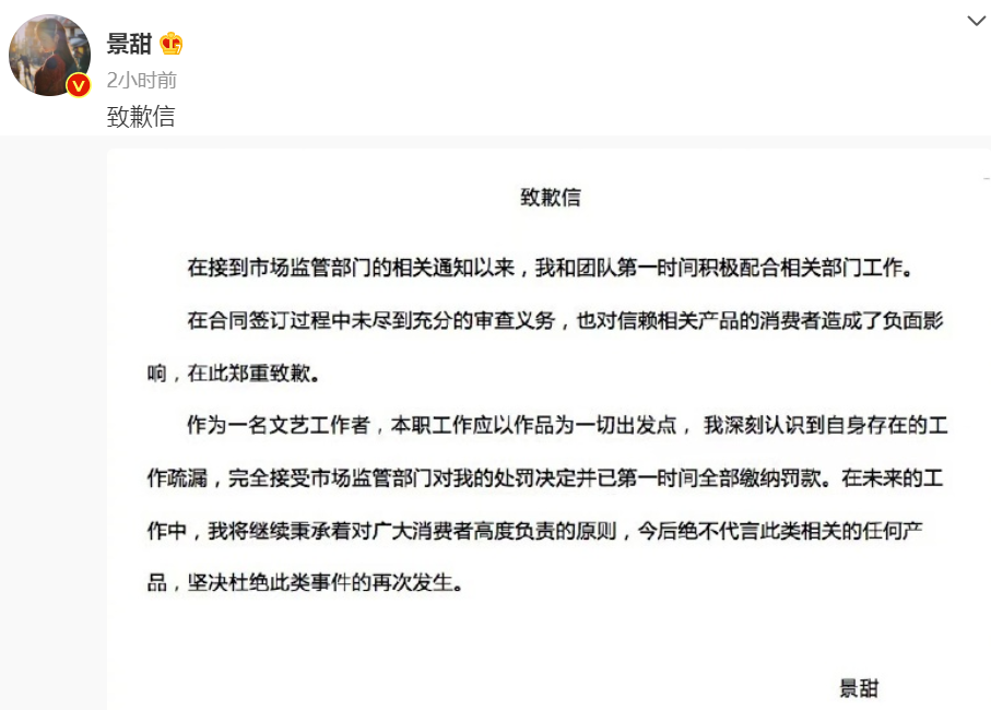 景甜被处罚消息一出,更是有两个品牌,直接删除了之前发布的与景甜相关的内容,避嫌意味明显。
