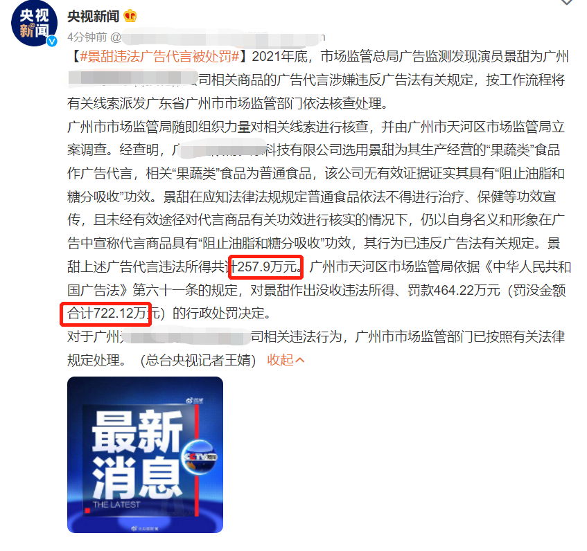 对此,广州市市场监管部门也对景甜的违法广告代言行为依法罚款722万元,其中257万元是景甜在广告代言中违法所得,464万惩罚是官方处罚。
