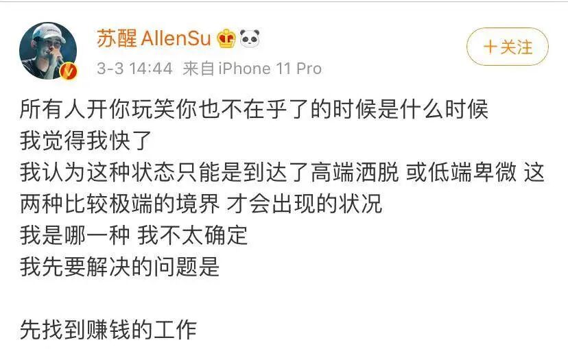 他甚至在微博哭穷,直言:“我先要解决的问题是,先找到赚钱的工作。”