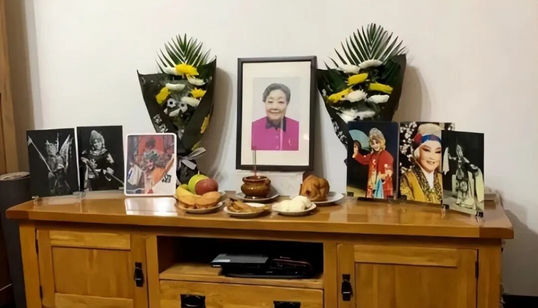 简洁庄重的灵堂上放着马金凤老师遗照,在遗照旁还摆放着多张她生前演出照片。