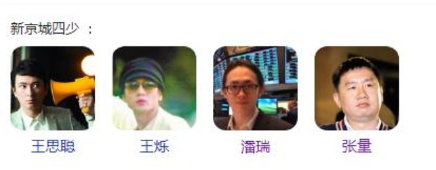 这一波“四少”破产的破产离婚的离婚,隐退的隐退,火力显然不足了,于是网友又鼓捣出了“新京城四少”。 除了王烁依然在榜,其余三位则替换为:王健林的儿子王思聪、潘石屹的儿子潘瑞、张力的儿子张量。
