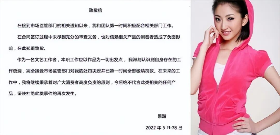 虽然景甜在第一时间就发出道歉信,但她的事业还是受到了影响。况且有明文规定:受到处罚的人三年不得代言广告。