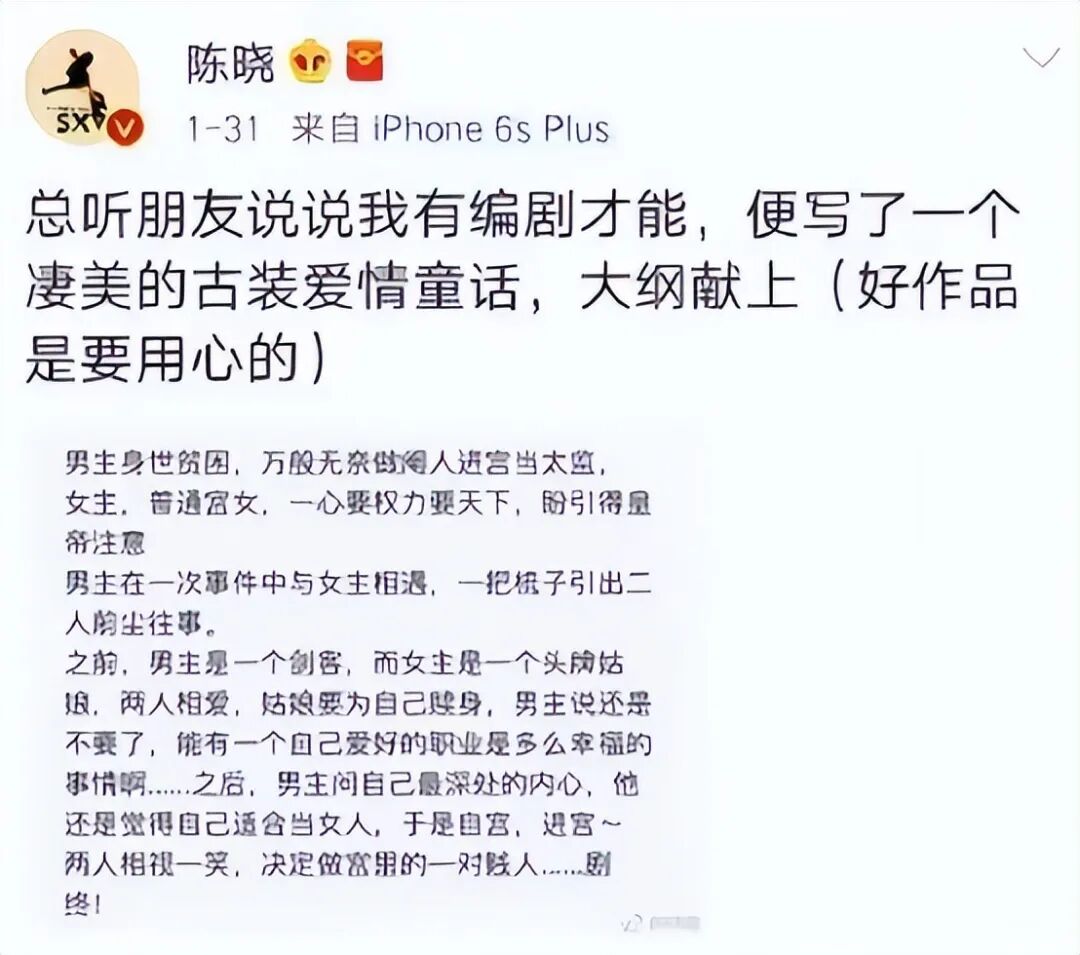 很快,陈晓在微博迫不及待地官宣了恋情,他坦坦荡荡、毫无隐藏地亮出了自己的恋人。