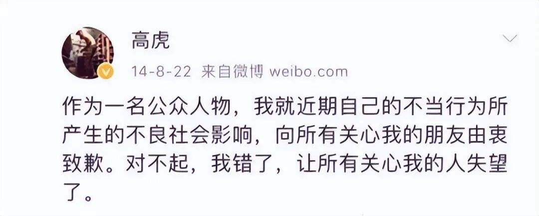 2014年处于事业低谷期的高虎因聚众吸毒被抓,随后锒铛入狱。尽管高虎对因他所产生的不良影响道歉,但“劣迹艺人”的标签将伴随他的一生。