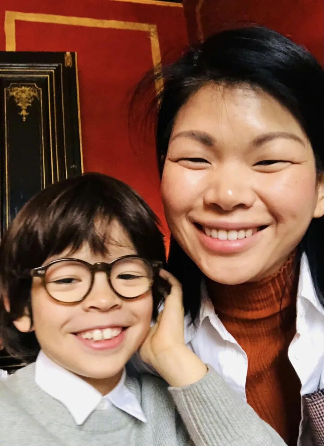 9岁的混血儿子长得阳光帅气。吕燕会和其他妈妈一样,时常在社交平台晒亲子照。儿子爱吃汉堡,她也会跟着教程去学做。