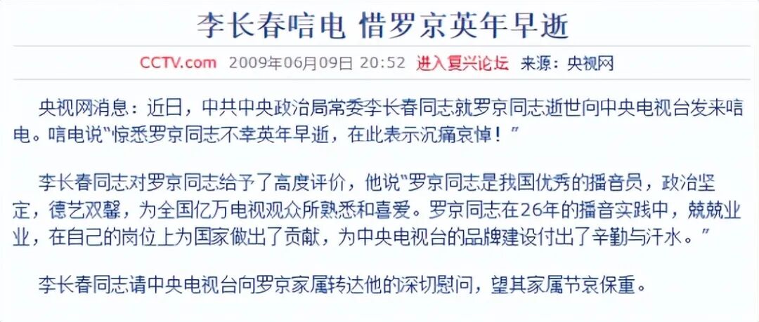 当天《新闻联播》播报:新闻联播播音员、中共17大代表罗京在2008年8月31日完成最后一次荧屏直播后,于2009年6月5日因淋巴癌医治无效离世,享年48岁。