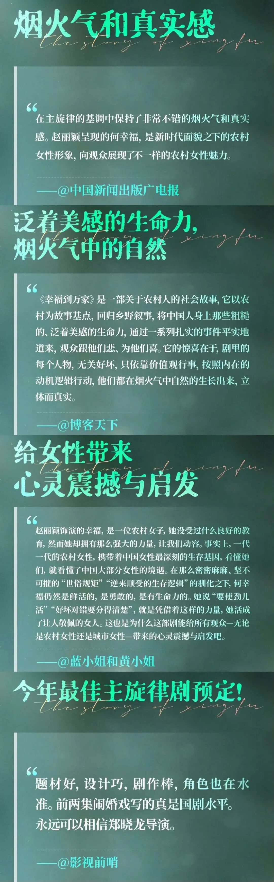 在当下充斥着偶像剧、古装剧的电视剧市场里,期待乡村题材正剧《幸福到万家》能突出重围,成为暑期档的一大王炸。