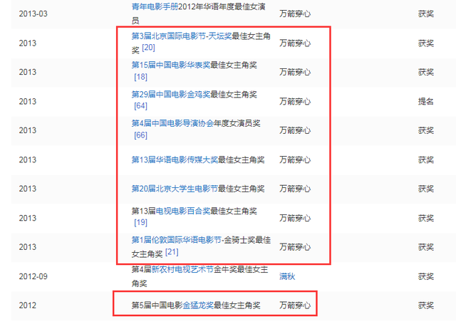 2012年,《万箭穿心》上映之后,她凭借影片中的精彩表现,先后斩获了多项大奖。