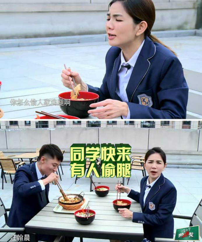 他和ella被节目组安排着和一个学校学生同桌吃饭,在学生不在场的情况下,他伸出筷子去偷吃学生的鸡腿。