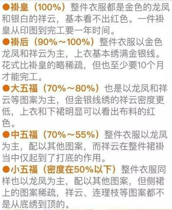 中式的裙,褂根据金银线的刺绣密度可分为褂皇、褂后、大五福、中五福、小五福;“小五福”手绣密度最小,价格也最便宜。