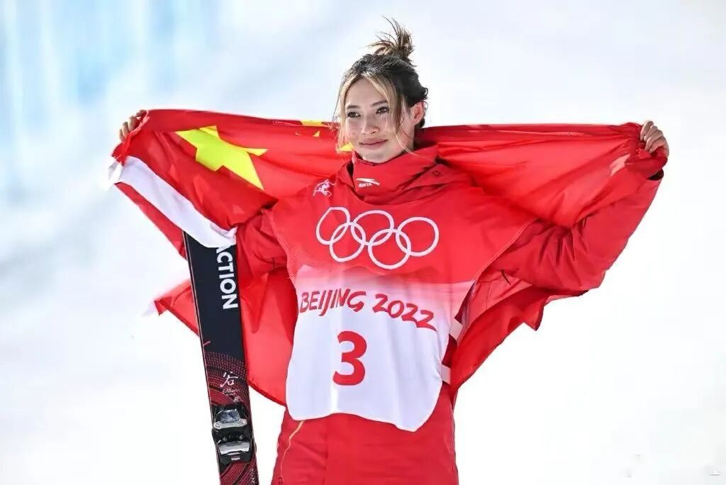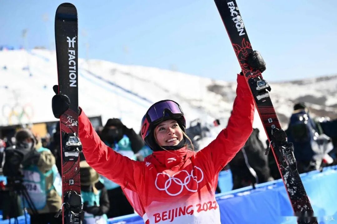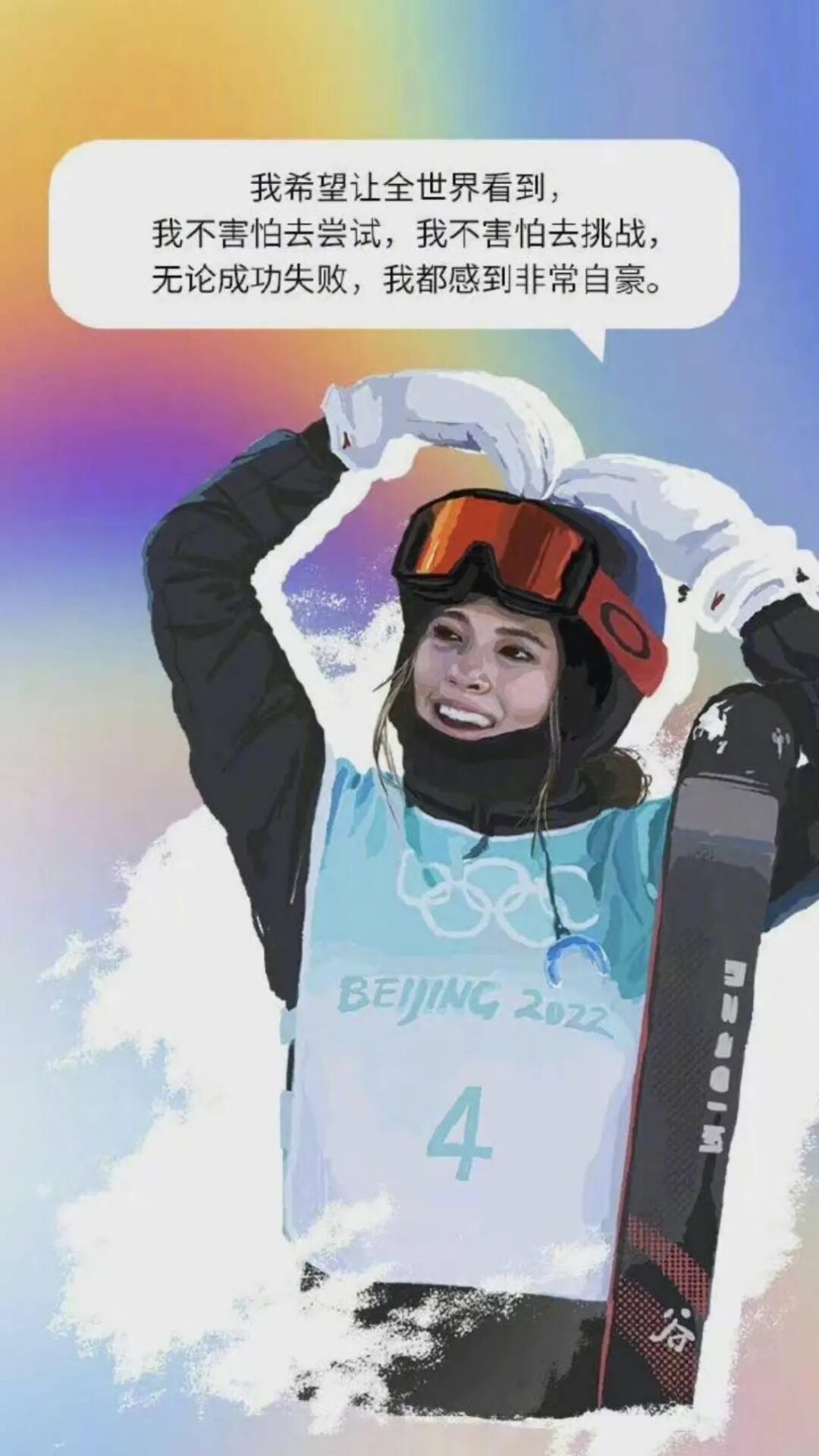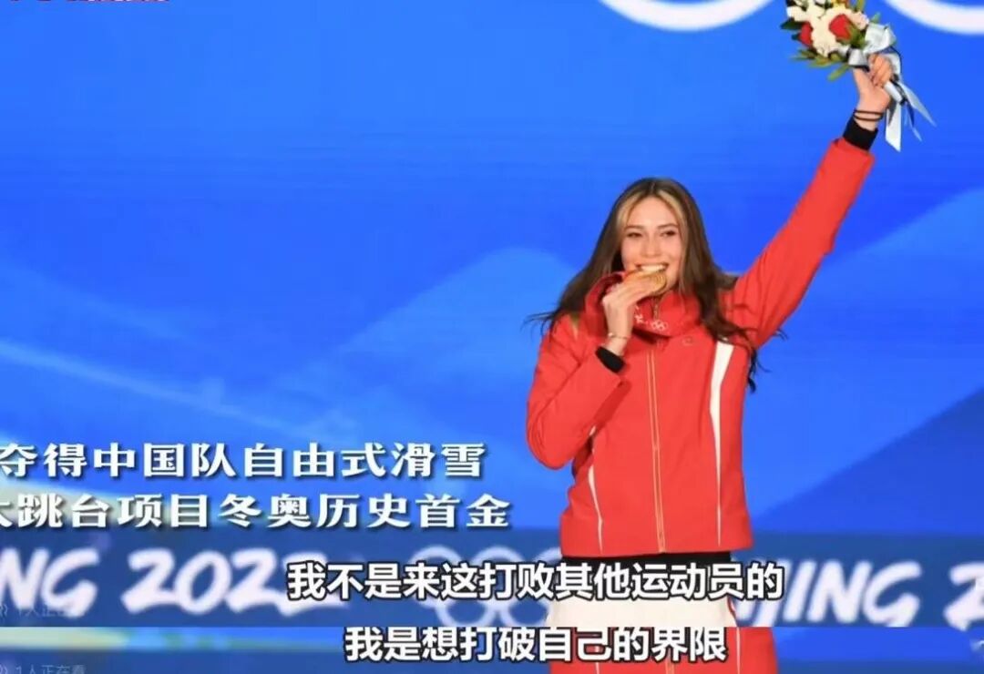 与生俱来的热爱,让她在并不擅长的自由式滑雪大跳台项目中战胜了自己,临时决定挑战1620动作,空中转体四周半后抓板后完美落地,获得了她奥运会的首金,为中国队拿下了第三块金牌。